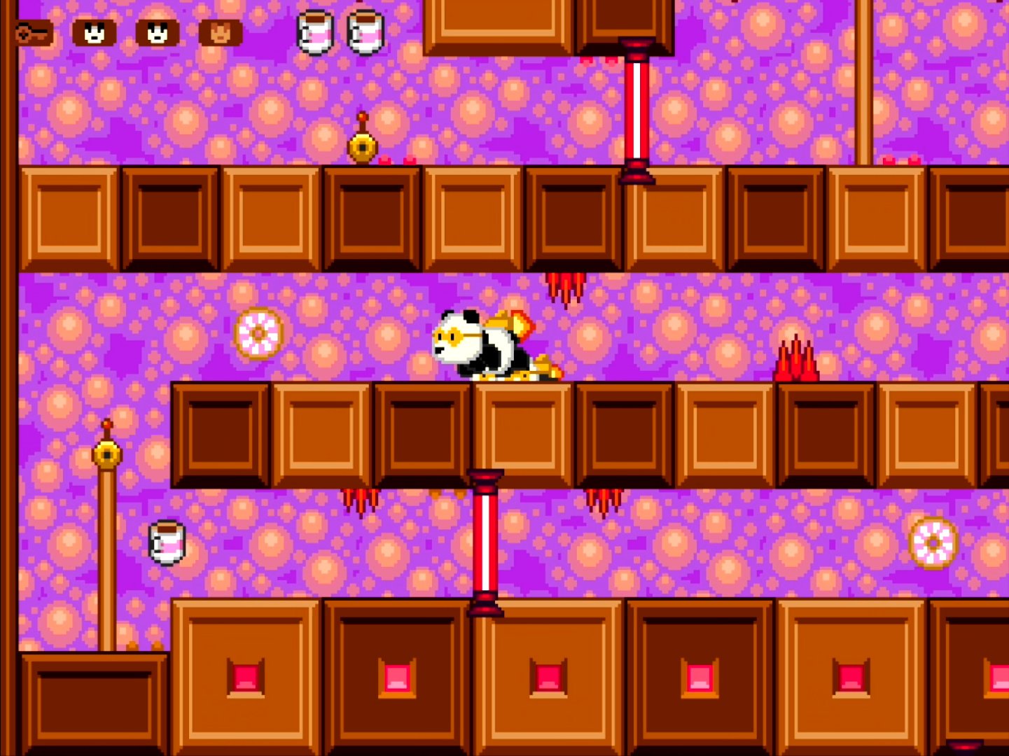 The core focus of the game is guiding the titular rocket-powered panda around a series of stages, collecting both badgers (a number of which are required to exit each level) and biscuits (which add to your score). While it initially feels like a multi-directional shmup, your panda lacks the ability to attack enemies with projectiles; instead, you have a limited number of dash attacks which you can use to take out foes. These are replenished by grabbing cups of tea.